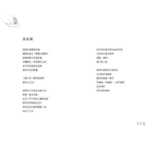 嘉琪在詩中書寫動物──無論是作為實體或比喻──之頻繁,恐怕是劉克襄以降第一人,有如都市中的自然靈媒。從白犀、紫蝶、斑馬、夜鶯,到鯨魚或蒼蠅,非僅環保關懷可以解釋,我以為那是一種視角,不是以看人的眼光來看動物,而是以看動物的眼光來看人。人類把動物關進囚籠的時候,也將自己從自然隔離出來。但嘉琪寫來可以舉重若輕。例如〈我是貓〉,有如卡夫卡《變形記》的喜劇版:都自知是貓了,還是人模人樣去上班,無人引以為異。又例如〈魯蛇〉真的是寫蛇:「每一次蛻皮都是/推翻舊的自己」、「每一次蛻皮都是/被新的自己推翻」。明明是寫在社會無處容身的處境,卻不忘在不同的位置自我檢視。視角不同,觀點自然有別於過往相關主題的書寫。