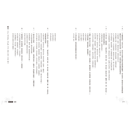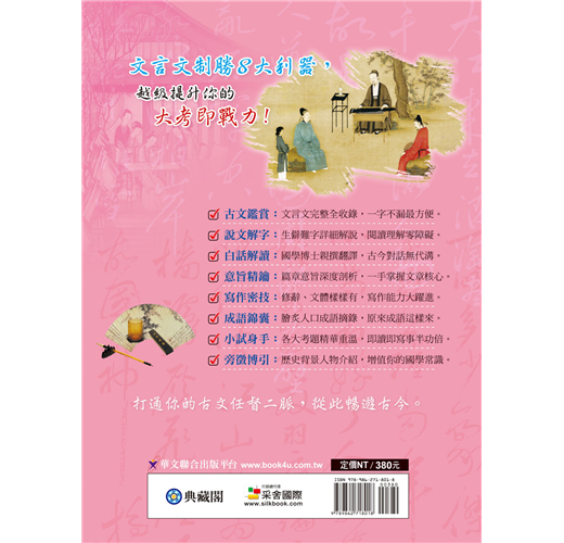 每一篇文章先從原文、註釋、翻譯和意旨等單元著手,幫助你掌握基本知識和考試內容,再輔以寫作秘笈,詳細剖析文章內的各種修辭、章法、句式和體裁,深入淺出地引導你從古文中學習寫作的技巧,並且提供課外的例句閱讀與說明,以利你舉一反三。除此之外,還提供各篇章的成語精粹,看文學大家如何運用成語寫作,同時熟知典故,增進你的文學涵養。豐富的考古題與編者自編的試題演練,則讓你可以馬上驗收學習成果。最後,本書旁徵博引了與該篇有關的歷史背景、人物簡介、延伸閱讀等相關知識,讓你不僅僅是讀完關鍵五十篇文言文,更加深加廣了自己的國學資料庫。