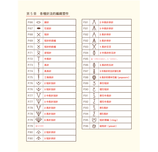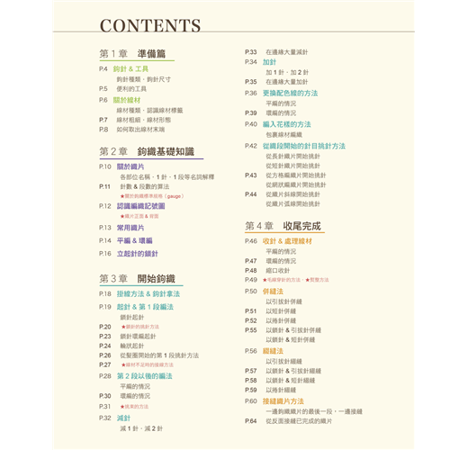 另貼心整理了各種針法的一覽表,更適合在作進階鉤織時參考使用。