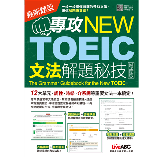本書將新多益考試中常考的文法概念統整分類為十二大單元。每單元一開始先帶領讀者認識新多益文法題型,提供解題範例並歸納答題訣竅。接著再條列出文法重點,由基礎文法觀念開始,由淺入深分析各種衍生規則、慣用句型及特殊用法。本書將複雜的文法概念以清楚易懂的表格呈現,搭配中英例句與適時的補充說明,再加上可立即驗收成果的隨堂測驗,相信能幫助讀者融會貫通、迅速掌握文法觀念,並將易混淆的文法陷阱一一破解,成功在新多益考試中拿下高分。