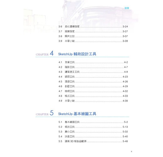 CHAPTER 4 SketchUp輔助設計工具:介紹SketchUp的輔助設計功能,其主要作用是對模型進行不同的編輯操作,並以實例進行結合,內容豐富且非常重要。SketchUp輔助設計工具包括主要工具、建築施工工具、測量工具、鏡頭工具、漫遊工具、剖面工具、檢視工具、樣式工具和構造工具等。