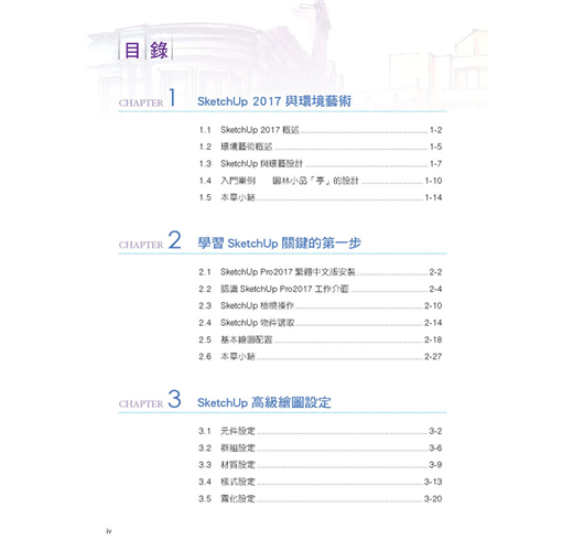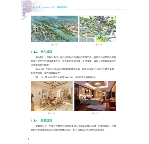 CHAPTER 1 SketchUp 2017與環境藝術:介紹SketchUp 2017軟體基礎知識、環境藝術概述以及環藝設計,帶領大家快速進入SketchUp的世界。