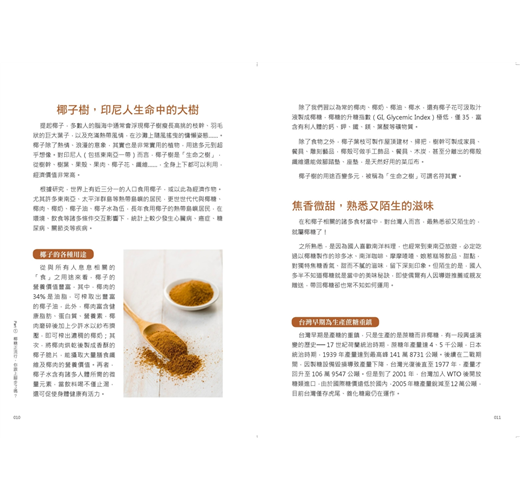 講到南洋食材,清爽可口的椰子及其製品,總是為人津津樂道。但你聽過「椰糖」嗎?椰糖並非椰子果實的衍生品,而是從椰子花萃取的天然蜜糖,色澤金黃、微淡焦香、甜度適中,更特別的是,椰糖的升糖指數(GI值)僅35,比起砂糖110、黑糖99、蜂蜜88、楓糖漿73,是更健康低負擔的選擇。本書是當前市面上少見的椰糖書籍,提供更深入、豐富的椰糖訊息,幫助讀者全盤了解椰糖的優點、健康益處和料理運用。