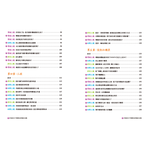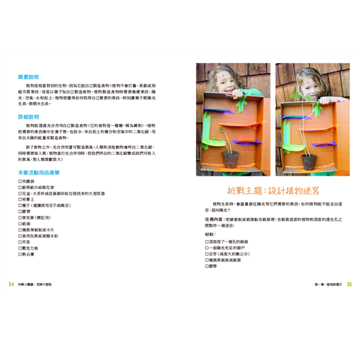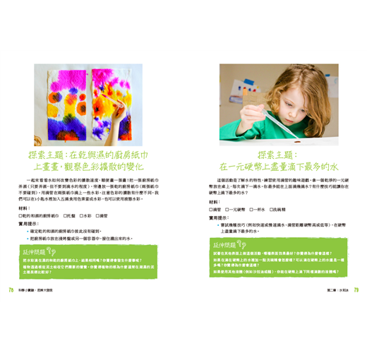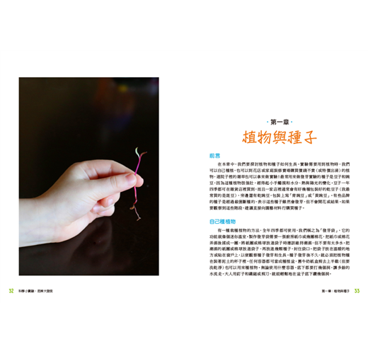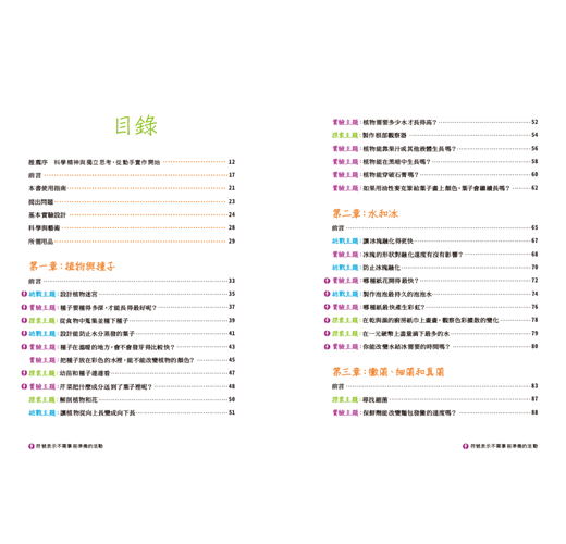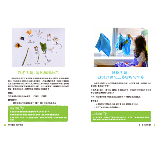 書中針對各種領域提出問題,例如:種子在溫暖的地方發芽得比較快?還是寒冷的地方呢?為什麼我們總是在春天快結束時去整理花園呢?提出問題後,家長們便可以帶著小朋友一起設計實驗遊戲,引導孩子們思考、辨別、挖掘更多問題!例如: