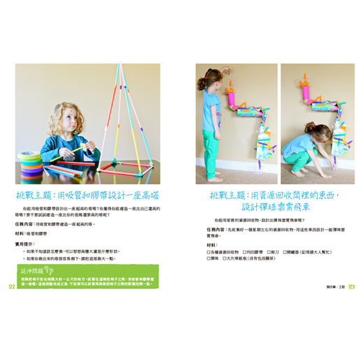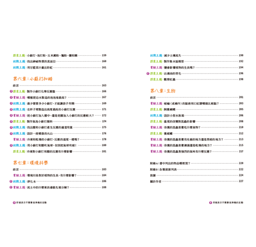 實驗有時候會失敗,有時候帶來的問題往往比答案還多,不過科學就是這樣。實驗即使失敗也有價值,孩子們可以從失敗中學習,並將這些知識運用在未來的實驗中。科學很少一成不變,也鮮少完美無瑕。書中許多活動刻意編寫得沒有標準答案。挑戰活動的用意是讓孩子們反覆嘗試,從錯誤中學習。