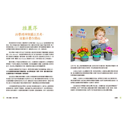 名人推薦:「學習科學並非為了單純習得知識與技能,更重要的是在動手與記錄中不停地自我挑戰與質疑,勇敢而誠實地跨越我們曾經犯過的錯誤,並且終身維持自主學習的態度與能力。」──詹益鑑 親子動Fitmily創辦人