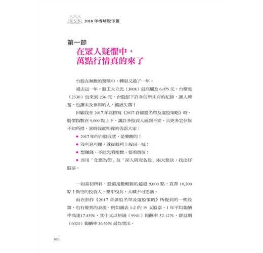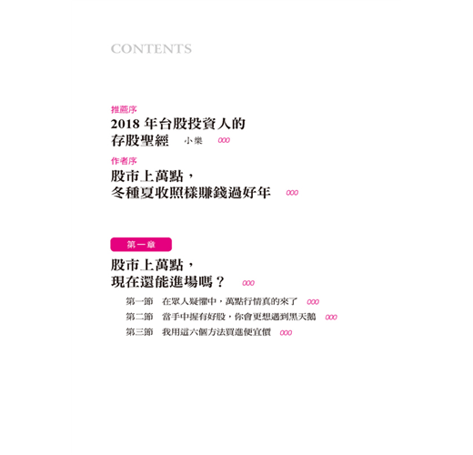 以溫老師豐富的投資經驗分享,加上流暢易懂的文字說明,我相信本書將會成為,台股投資人在2018年必讀且收藏的作品,我也很高興有這個榮幸為本書寫序。在此也利用這個機會,謝謝溫老師之前為我的第一本投資書寫序。