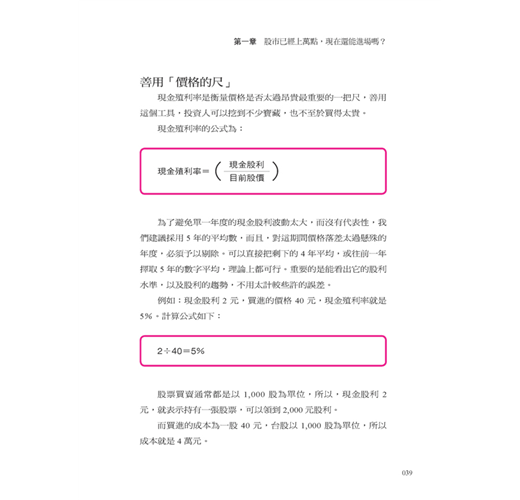 面對臺灣利率環境仍低的情況下,溫老師還是認為存錢不如存股。因為目前銀行定存的利率大概在1%左右,但只要運用他在書中提示的平均現金股息殖利率法,算出雪球股的便宜價,耐心等待並分批買進,就可以輕鬆獲取超越定存數倍的報酬率。