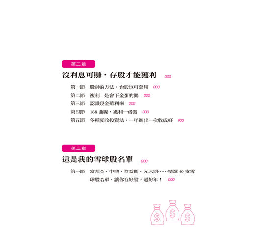 之後,在讀者引領期盼下陸續出版《輕鬆滾出雪球股》、《存好股,我穩穩賺!》,以及《買房賺千萬,比買股更簡單》,亦名列三大連鎖通路的投資理財排行榜,各大財經媒體專訪邀約不斷,並受邀為《Smart智富》月刊財經講座主談人,是股市的雪球股達人。