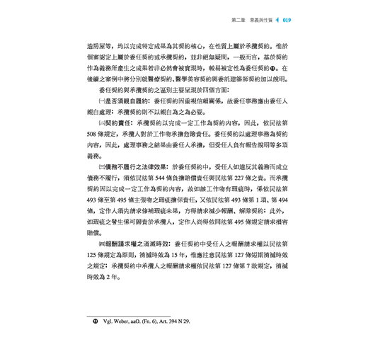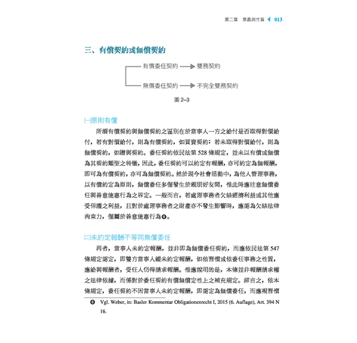 至於在比較法研究之對象選取上,由於我國民法肯任委任契約得為有償契約,而德國之委任契約僅限於無償契約,因此,在相關之利益衡量與立法評價上多有不同,故德國之相關規定並非為最適當之研究對象。相對於此,瑞士債法之委任契約可為有償或無償契約,在性質上與我國相同,而其債之關係的體系結構與德國相去不遠,因此,更適於作為比較法研究之對象,故本書在論述上多有參照瑞士債法之相關規定與實務運作,以提供更多的思考與討論。然另一方面考量本書並非研究專論,因此,無論在參考瑞士或德國之法規範上,均以法規與實務判決為主要對象,相關學理之探討留待未來以專文或專書呈現。