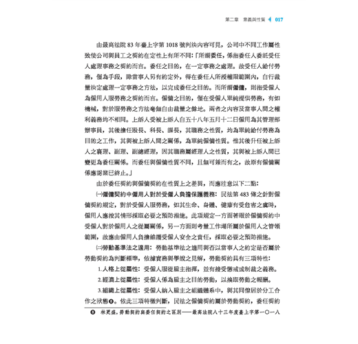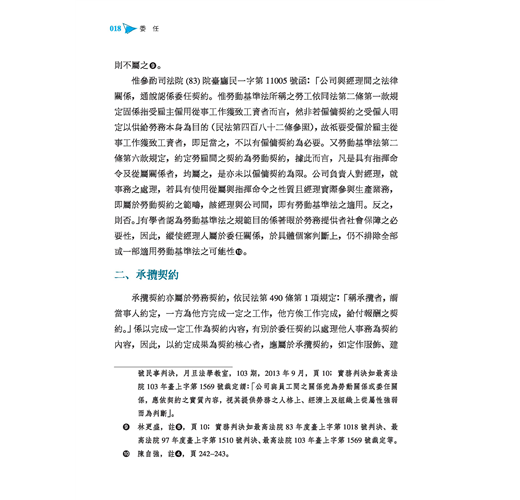 學生在學習委任契約時,首先會面臨的問題是契約定性。由於勞務契約中以委任契約、承攬契約與僱傭契約三類為基本且常見之典型,然而三者之契約內容與雙方當事人間之權利與義務大不相同,因此,在修習債編各論之勞務契約時,必然以此三類型為主要範疇,而三者間之區別標準則成為重要之研習課題。若以光譜來描述的話,僱傭契約處於光譜的一端,非常強調受僱人對於僱用人之從屬關係;承攬契約則處於光譜的另一端,承攬人擁有高度的自主性;而委任契約則落在前面二者中間的某處,一方面應本其專業與經驗為委任人處理事務,另...