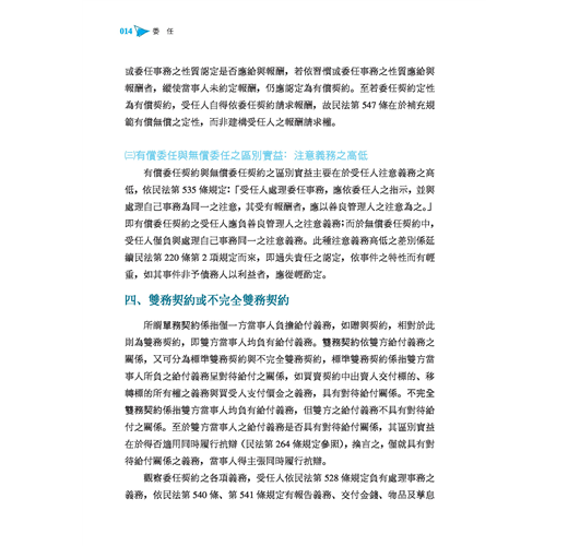 最後,關於本書之撰寫模式。由於法規之目的在於處理實際生活中所發生之事件,因此,法院判決成為重要的研習資料,一方面可藉此瞭解常見之紛爭,以及藉此檢驗法規在適用解決問題上之妥適性,另一方面亦可瞭解法院適用相關法規之情形與態度。因此,本書收錄部分判決,其中部分放置於條文論述中,以與條文說明相互呼應;另一部分判決則改編成案例,以顯現其間之法律關係,並期望使讀者透過案例運用、思考相關之法律規範。再者,由於案例多涉及民事財產法之法規,而不以委任之規定為限,因此,本書在案例說明的部分,先以請求權基礎呈現當事人間法律關係之輪廓,再就與委任契約相關之部分加以說明。以請求權基礎思考當事人間之法律關係,其優點之一在於所呈現之法律關係相當符合當事人維護其權益之方式以及可能採行之訴訟方式。另一項優點則是請求權基礎具有提綱挈領之功能,分別依其法律要件與法律效果論述當事人間之法律關係,並援引所需之其他條文以資說明即可,可避免許多學生於研習民法過程中遇到之困擾,即常因條文過多,而不知從何著手,或始終遺漏部分條文(爭點)。