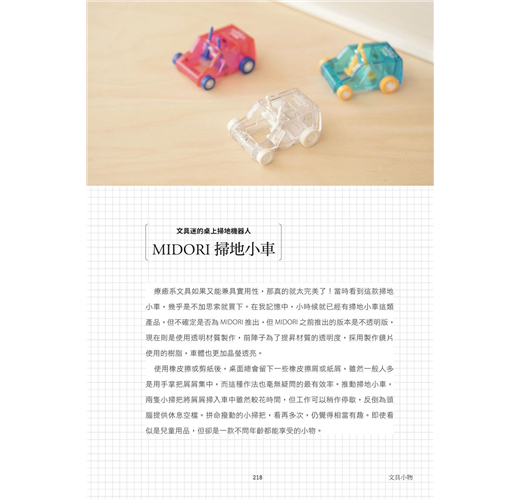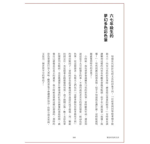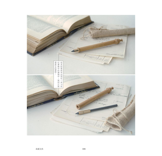 還記得小時候一拿到零用錢,就跑去前面的文具店蹲點,挑選最新的自動鉛筆、免削鉛筆、筆記本,當然啦,書籤小卡絕對不能少,抽屜放了一大堆永遠用不完的文具。沒想到二十年後,做了編輯,會和文具收藏界的高手Tiger一起合作這本書,看過「文具病」部落格的人一定知道,Tiger說起文具經頭頭是道,我從來沒想到一件小小的,占據生活面積並不大的筆、筆記本,背後的故事那麼的長,也那麼有趣,每一次文具的改版、形體的演進,都藏有設計者和使用者之間,看不到卻間接的激盪與火花。