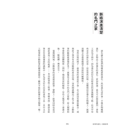 演化論告訴我們物種起源與進化,然而進化這件事,不僅在物種間進行,在物品上所發生的進化,更加快速,甚至可以說是激烈。書寫工具也不例外,因為進化而衍生出新產品的景象頻繁上映,有些並非由演化而來,而是突然出現,這種情況若發生在物種上,就連達爾文也會想破頭不知該如何解釋吧。