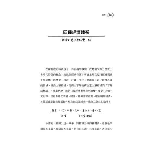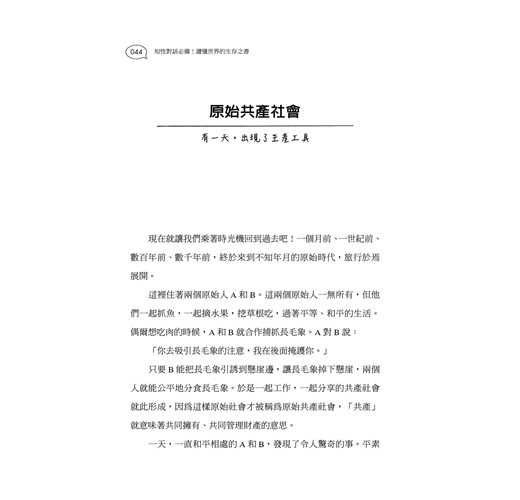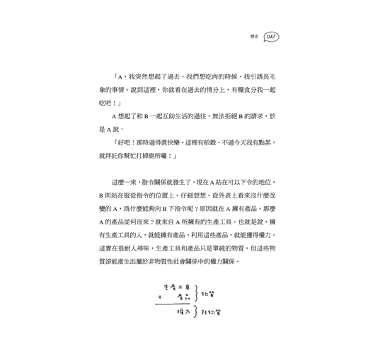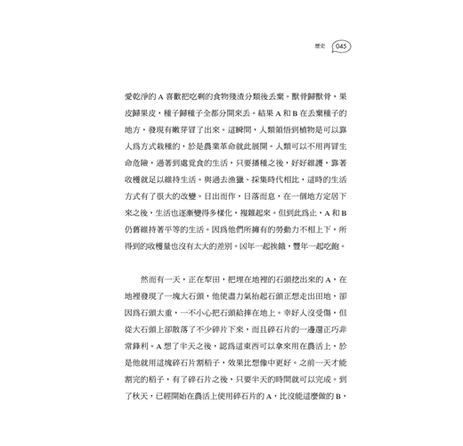 * 說明淺顯易懂,讓我也能用自己的話,將書裡所有內容重新詮釋並與人對談。作者將人類生活至今的過程如剝洋蔥般一層層剖開解析,說明很有趣,也讓人不禁讚嘆人類社會的演變。