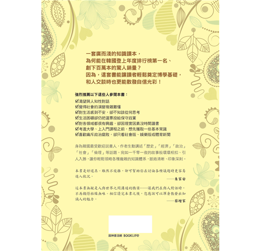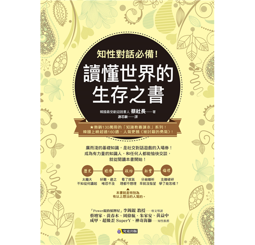 韓國人氣作家蔡社長這本書,無疑是人與世界之間溝通的橋梁,以淺顯易懂的文字,橫跨歷史、經濟、政治、社會及倫理等五個廣面,以「淺」而「廣」的方式快速地了解我們所處的世界,讓我們在與人對話時,不再顯得枯燥無味。相信讀完本書之後,您應該可以渾身散發出知識人的魅力。