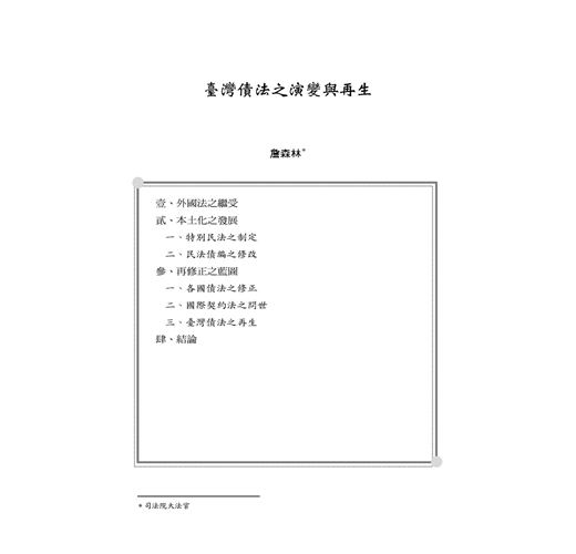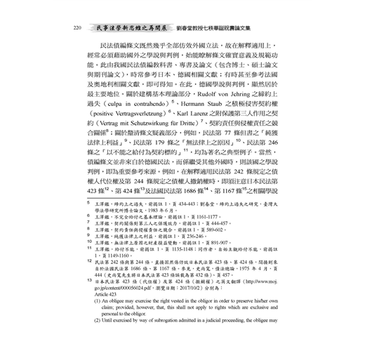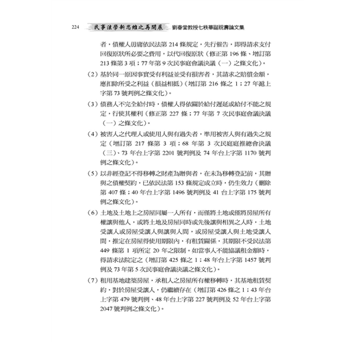 欣逢劉教授春堂先生古稀之年,劉教授之同僚、故舊及門生,應大法官詹教授森林先生及林教授秀雄先生之邀約,特撰文結成本論文集。本論文集之出版,除為劉教授祝嘏,並傳𠄘其在教學及學術研究方面之熱忱與勤勉外,更期展現以新思維促使民事法學進步之努力及成果,提供學術研究及實務參考之用,對於法學之進步有所貢獻。因此本論文集,𠄘續劉教授春堂先生還曆祝嘏論文集之書名,定名為:「民事法學新思維之再開展」。