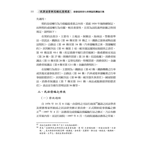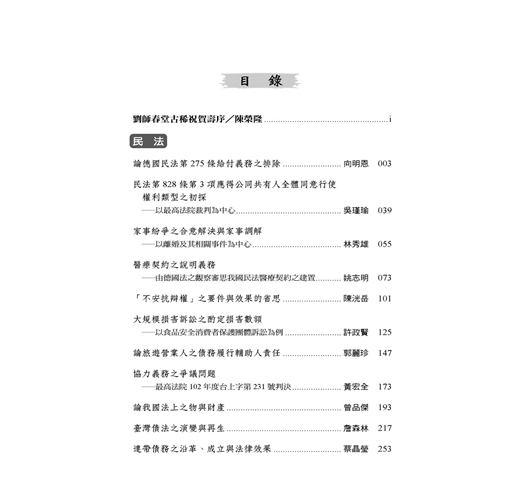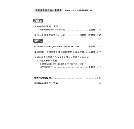 本論文集之出版,從開始倡議及邀稿,至印製成書及發行,前後僅四個多月,誠屬非常不易,難能可貴。由於劉教授長期工作及研究範圍,主要在民法、消費者保護法、保險法三大領域,因此本論文集所收錄之文章,亦以民法、消費者保護法、保險法之重要課題為中心,以張顯劉教授對這三大領域之關注及努力。本論文集之作者,皆為學術及實務界之碩彥,所撰論文,論述條理,探討深入,立論新頴,見解精闢,內容豐富,故為值得一讀的作品。