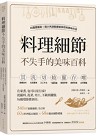 《料理細節不失手的美味百科》廣蒐名廚達人的數十項私房絕活,讓你從容應對諸多「廚房意外」,比方「乾香菇忘了發泡,如何快速解決」、「烤魚過鹹巧用檸檬酸能搞定」、「鹽巴加太多,馬鈴薯能救回」、「受潮的海苔,三十秒回復美味」等等。