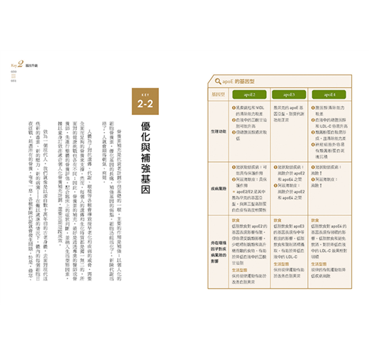 「優化與補強」正是基因升級的策略,例如,基因中分別為apoE2 、 apoE3 /、apoE4的人,需要的飲食與運動就不相同,飲食、作息、營養補充、運動都要適合自己的強基因,身體才會更健康。