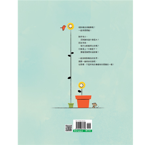 這本書乍看之下是介紹相對的概念,因為是給小孩看的繪本,以為就是介紹概念清楚的相對詞。然而這本書可沒這麼老套喔,第一層次為常見的「相反」相對詞,後來逐漸鋪陳為「相對關係」的相對詞,再提升到更高的層次思考相對概念,配合圖畫從「不同的視角」呈現的視覺效果,愈讀愈有意思呢!