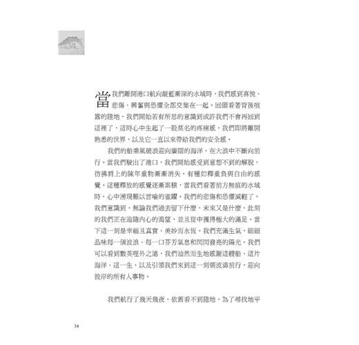 我們生活中的一切將我們引領到這個出發點,我們這趟發現之旅的船即將下水。在我們身後是已知的世界:長久以來忙碌的模式。在我們前方則是無邊危險的海洋,以及前往光之島和更遙遠彼岸的旅程。這片海洋延伸至這個淺淺的港口和我們停泊的船隻,不安地等待著,想要挽留我們,同時間卻又堅定不移地向我們招手。我們的內心蠢蠢欲動,不再滿足於港口的喧嘩,我們渴望自由和冒險,想要更深刻的人生體驗,並且發掘在我們這個小小的已知的世界之外究竟隱藏什麼寶藏。