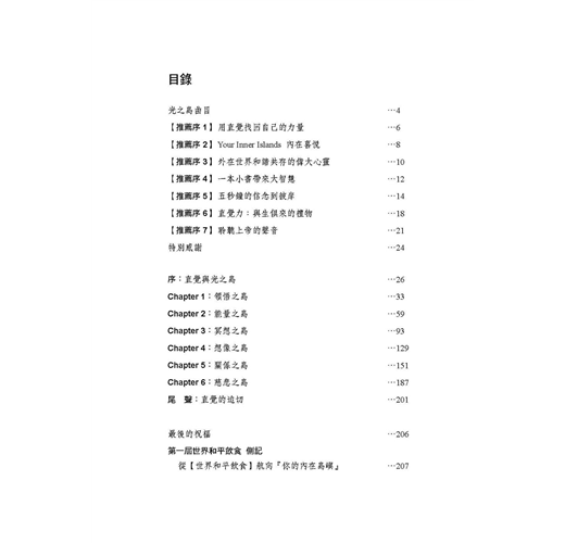 當我們前往彼岸尋找神秘的光之島時,我們正踏上更廣闊和連結更深層的覺知之境。也許我們會發掘有助於我們解開、釐清和照亮困境與問題的直覺能力,讓我們有種了然於心的平靜。除了引導我們心靈的進化外,直覺還可以協助我們在個人事務上做出明智之舉,並且在創意方面激發我們的創見,為我們的日常生活帶來靈感。我們可能會發現,直覺是我們最好的朋友和盟友,而且這份內在的指引可以讓我們迎向更高層的悟性和自由。我們知道,我們的文化教育大多忽略這個寶貴的內在資 源,並且從未教導我們如何培養直覺。