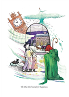 檯燈突然亮起,本已熟睡的兩人也醒了,他們起身爬到窗邊看著對街孩童的耶誕晚會,邊看著有錢人家歡欣慶祝,邊數著自己手上的想像蛋糕,在不大的窗邊小凳上開心地大笑著。這時,房門打開了,一位老人面貌的仙女走了進來:「Have you the bird is blue?」(你們這裡有青鳥嗎?)