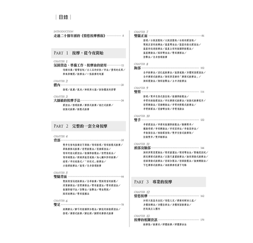 2.超實用按摩指南。六種按摩技法,從頭、頸、臉、胸、背、手、腳,全身感官紓壓按摩。