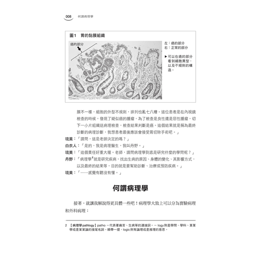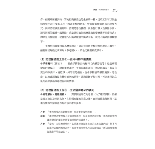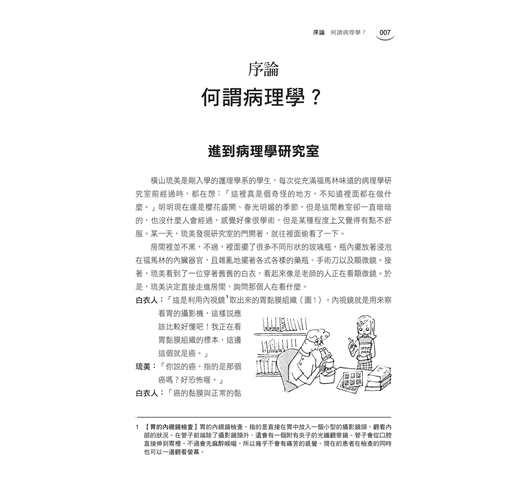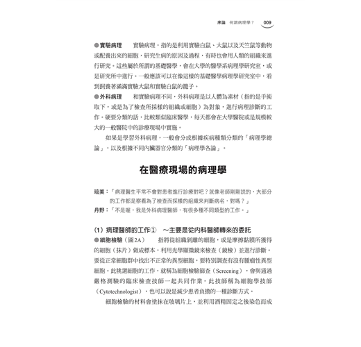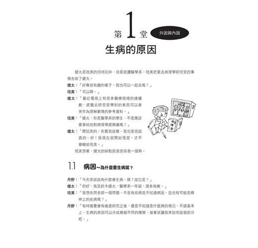 為了讓複雜的病理學更容易理解,書中更加入了琉美&健太兩位大學生與丹野老師的角色,並以對話的方式進行解說,跟著他們腳步一起進入病理學的世界吧!
