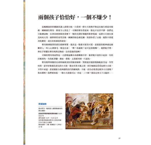 我想這就是本書作者的用意吧!一舉打破仰之彌高的藝術藩籬,帶領讀者勇敢踏入羅浮宮這座博大精深的藝術殿堂,鼓勵讀者以直觀的方式,輕鬆欣賞這些畫作的趣味。如此一來,羅浮宮不再是讓人戰戰兢兢,大氣也不敢喘一口的聖地,反倒成了一座蘊藏豐富寶藏的樂園呢!欣賞藝術真的可以很輕鬆,不妨丟開課本,跟著作者的腳步,看看羅浮宮還有哪些畫作讓人瞠目結舌、捧腹大笑吧!有機會帶著這本書參觀羅浮宮,你一定會比其他訪客發現更多的樂趣。