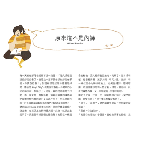 什麼樣的幽默可以讓大人小孩同時笑出來呢?本書精選32位繪本創作者,以「好笑的書+作者簡介+好看的書」來進行,每篇的最後都是開放式收尾,讓讀者有意猶未盡還沒結束的期待,就是為了吸引讀者繼續讀下去,發掘更深的體會。這是作者個人主觀的決定,也是很任性的看書與寫作方式,有如一個選品店的概念:選我喜歡的,也希望你喜歡,更借此體會閱讀不帶任何目的,純粹享受一篇圖文並茂的故事。