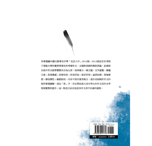 本書選編中國大陸著名中學「北京八中」2012屆、2013屆近百名考取了重點大學的優秀畢業生的考場作文,文後附老師的精彩評論。此書結合高中作文教學實際共分為九章,每章確立一個主題:文字感覺;審題立意;真情實感;思想厚度;時事評說;睿思哲理;論證結構;想像聯想;修改潤色;細節描寫。內容不僅有優秀範文,還有老師關於作文的寫作要領講解,突出「教」字,旨在幫助廣大高中學生的作文寫作水準得到實質的提升。這一點是目前其他很多作文書不具備的優點。
