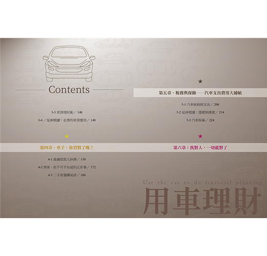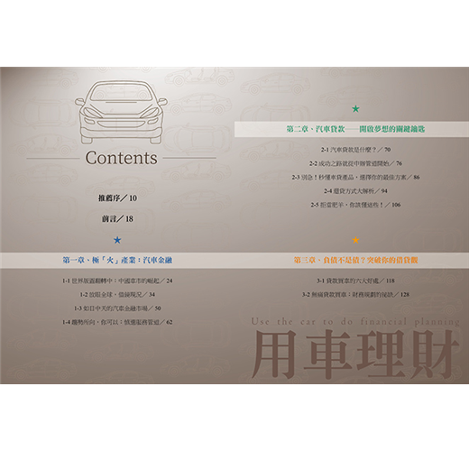 本書從中國汽車市場的飛躍成長,帶領讀者了解汽車金融產業的蓬勃發展,再延伸至二手車市場、汽車保險、稅務等,一次搞懂汽車金融、搞懂這塊餅究竟有多大。