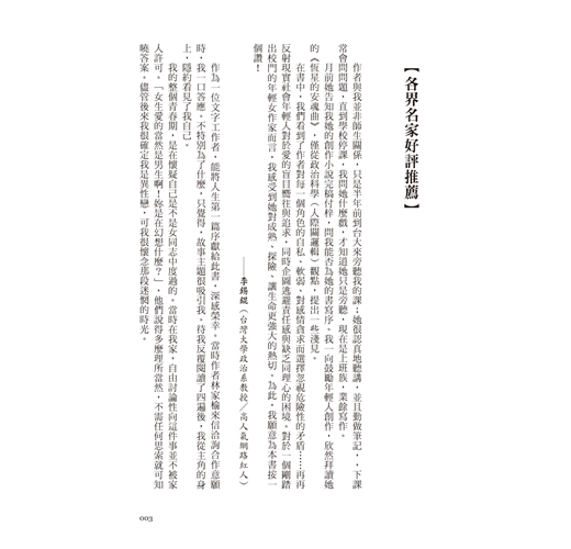 因對於小說創作結合社會議題與法律實務抱持強烈興趣,故於大學畢業後於法律事務所覓得職務。期盼能透過自己的文字傳達出一些個人認為重要的價值。