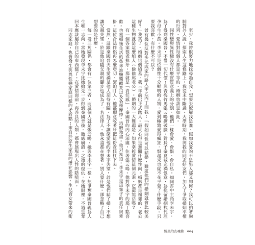「我知道妳不相信我,但妳卻想要盡妳所能地保護秦國晉,所以才即便再不滿也仍然坐在這裡替我籌畫記者會,我很感激妳,或許我沒有資格這樣說,但我也很謝謝妳這麼照顧秦國晉。」站在門外的我只能斜斜地看見張云暘的側臉,她慘白的面頰上掛著一個虛弱的笑容,但眉間卻深深地皺著,像是在擔心著她所說出的一切。「但是秦國晉、他和他的家庭、他和小宇,還有妳自身的堅持,真的都沒關係嗎?」