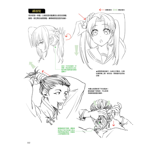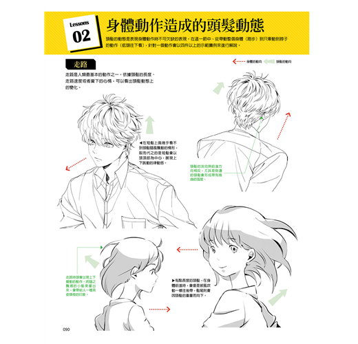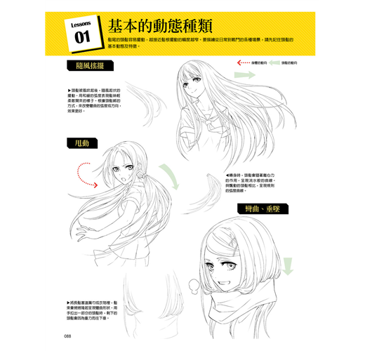 ★ 髪流的流向、身體動作方向、頭髪的動態方向等,以箭頭清楚標示,有益於理解
