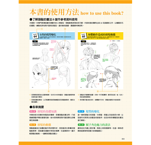 從髮流的方向、頭髮的背面、到舞動的頭髮動態(隨著人體晃動的頭髮)等等,不論是輕巧的動作還是大幅舞動的動作,都能感受到其美麗之處、震撼人心的魄力。收錄了所有變化的技巧。