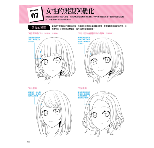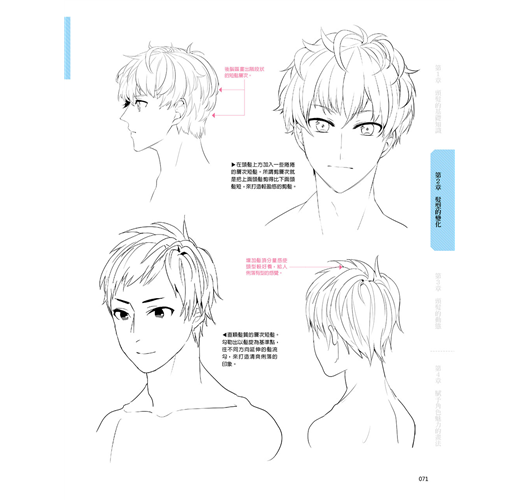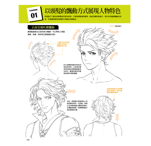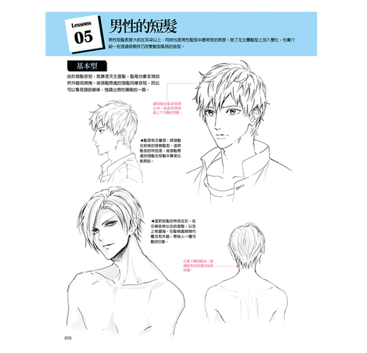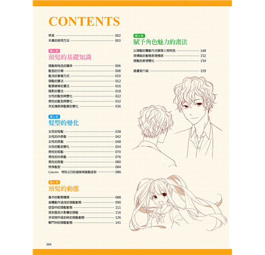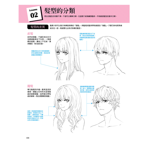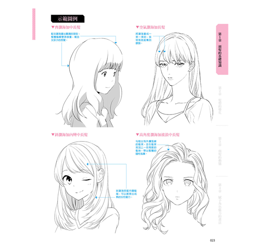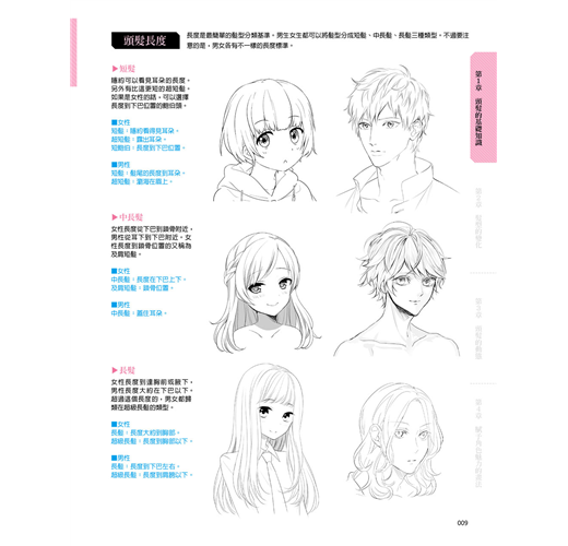 將頭髪分成短髪、中長髪、長髪以及造型四大類,將男女的髪型收錄進來,並針對各種髪型的畫法進行解說。
