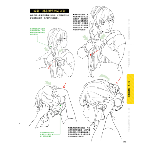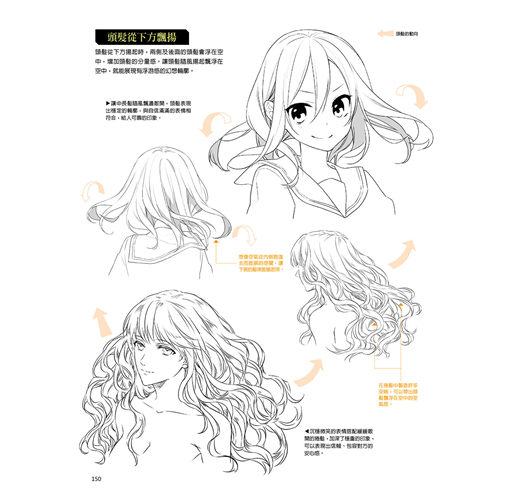 不僅將構成頭髮的要素做了細項分類,還能夠演繹出生動的頭髮動態。這樣的技法書絕無僅有、十分優秀,能夠讓讀者清楚理解圖例中的頭髮架構。