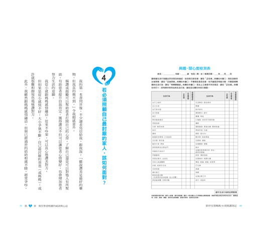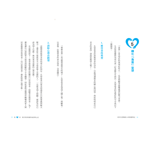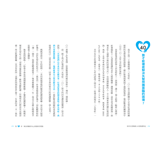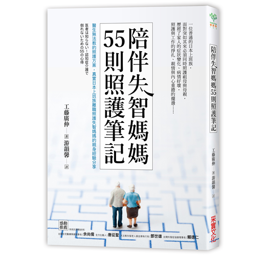 每天忙著照顧失智家人,沒有機會喘息的讀者,我也希望你能藉由本書放鬆心情,以輕鬆的態度面對自己的內心世界。此外,我的前一本書《照護失智家人的五十四個不後悔心得》(廣濟堂出版)是以選擇醫院的方法、利用人際關係建立照顧機制等為主題提出建言,提供各位參考。