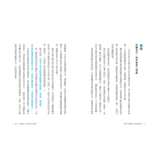 不過,我們可以改變自己,也就是照顧者的心。我將從有別於醫生和專業照護員的觀點,協助各位照顧自己的失智家人。衷心希望各位能從我無數的失敗經驗中,得到答案與幫助,這是身為作者最大的榮幸。
