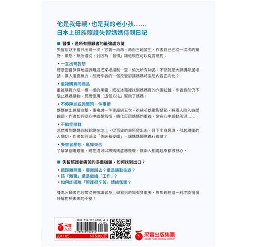 日本上班族照護失智媽媽侍親日記一位普通的日本上班族,面對突如其來必須同時照護祖母與母親,兩種不同的照護情況,於是開始將自己照護經過、心得和方法用部落格記錄下來。歷經了種種困難與問題,家人的症狀變化、病情好壞,照護與工作的掙扎、親情與內心重擔的擺盪……,將最真實的照護集結成55則感動照護心得。