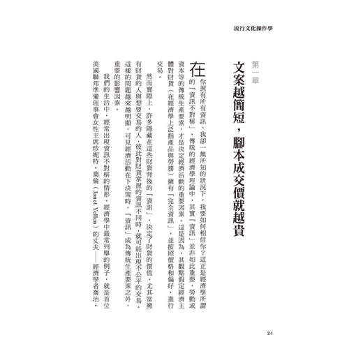 再舉個體經濟而言,過去有經濟學家認為,景氣越差,大家反而越愛看電影來消磨時間,但作者舉實證研究指出,在不景氣時,大家竟然變得不愛外出看電影,而當景氣變好時,大家反而更愛看電影,且效果還比降價來得好,這往往顛覆了過去很多人的直覺;另外,透過統計的研究,發現文案越簡短,腳本就越昂貴。