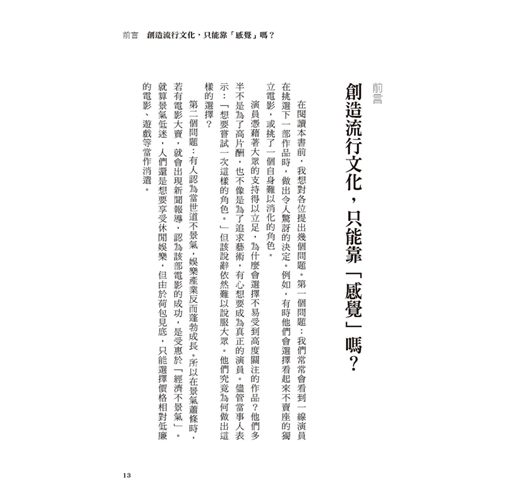 在閱讀本書前,我想對各位提出幾個問題。第一個問題:我們常常會看到一線演員在挑選下一部作品時,做出令人驚訝的決定。例如,有時他們會選擇看起來不賣座的獨立電影,或挑了一個自身難以消化的角色。