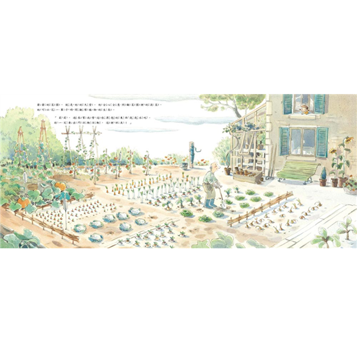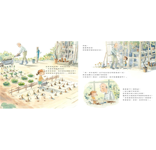莉莉的爺爺住在鄉下,他還有座天堂菜園。菜園裡種滿了番茄、南瓜、蕪菁、洋蔥和白蘿蔔,爺爺總是悉心地照料蔬菜,誇讚蔬菜們漂亮。