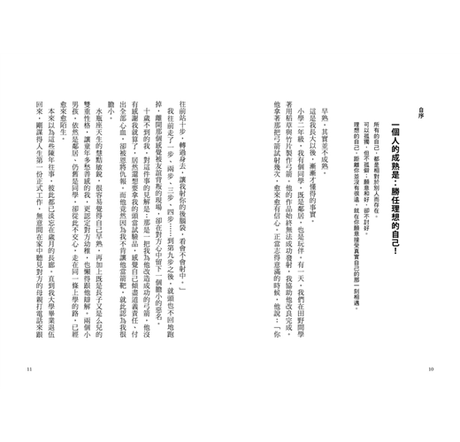 成熟的定義與指標有很多,當你讀完這本書的此刻,我最想分享給你的成熟定義是:能夠負起所有來到眼前的責任,就算是最困難的事,都心甘情願地當作是自己人生中最重要的使命去完成。
