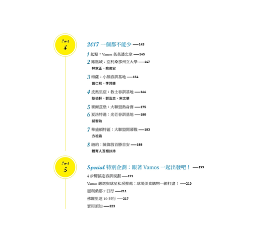 Vamos在本書獨家公開大聯盟春訓觀看攻略與路線規劃,4大步驟搞定春訓行程,並附台灣球員推薦餐廳。由過來人經驗分享、完備的規劃與建議,不怕踩雷撲空,讓你看好吃好,第一次看春訓就上手,跟著Vamos一起出發吧!