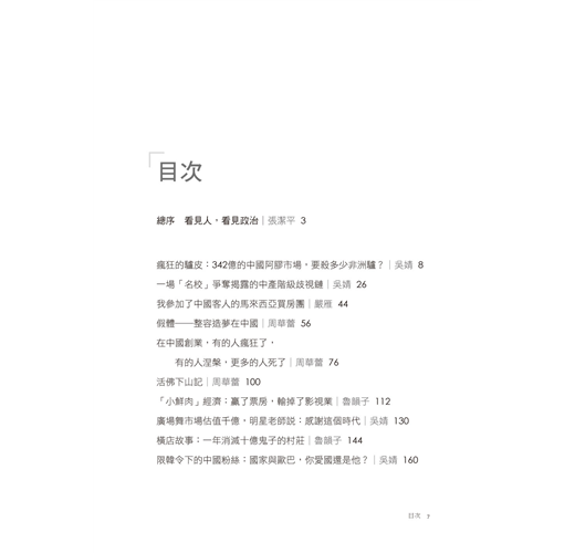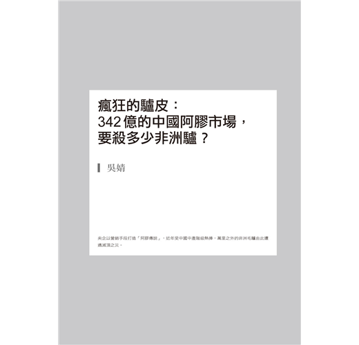 央企打造的中醫養生神話「阿膠」,讓多少頭非洲驢遭遇滅頂之災?/奮鬥一輩子進入中產門檻的爸爸媽媽,怎樣為孩子進「名校」爭得頭破血流?/去馬來西亞買豪宅的中國人,真的都是有錢人嗎?/在無神論的意識形態下,「活佛」為何成了北京城裡新貴?/「小鮮肉」何時代替演員,充斥了整個影視產業?/大媽們的廣場舞,竟然跳出了千億的市場?/十多年來跳入滾滾創業潮的年輕人,他們還好嗎?/在一年消滅十億「鬼子」的村莊,「抗日神劇」是如何被炮製的?/限韓令下的中國粉絲,愛的是國家還是歐巴?/叢林法則中的「整容流水線」重塑了無數女人的臉,安全感的普遍缺乏和對物化幸福的追逐,使一切都更瘋狂和不可預料--端傳媒記者透過10則深度紀實報導,揭示當代中國的真實地景!