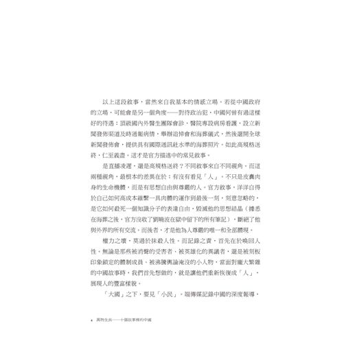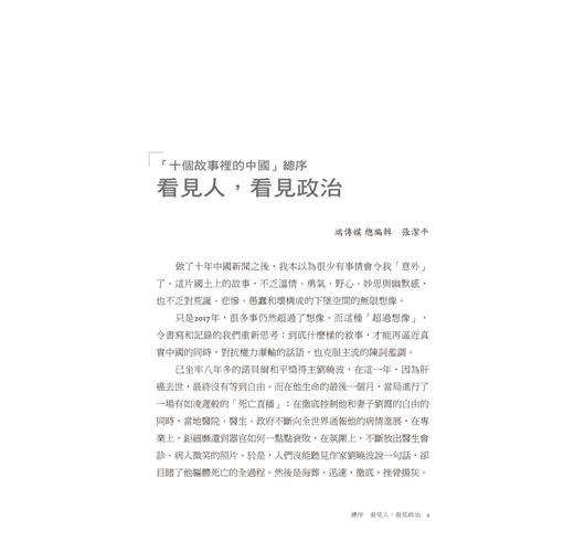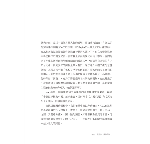 在挑選編輯的過程中,我們希望中國以外的讀者,可以在這些名不見經傳的小人物身上,看見人,看見真實中國的一角。而另一方面,我們也希望,中國大陸的讀者,如果有機會看見這本書,可以從這裡看見堂堂正正的「政治」——那個在日漸封閉的盛世裡越來越少看見的詞語。